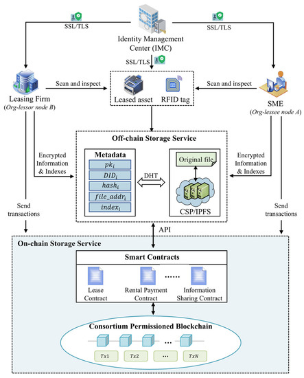 This research first provides a consortium blockchain-based leasing platform integrated with RFID devices [43], which incorporates stakeholders such as OEM, SMEs, LFs, MCs, and regulators. The platform is built by using Hyperledger Fabric (HLF) [44], which is an enterprise-grade permissioned blockchain platform facilitating information sharing among multiple organizations [45,46]. In general, an authorized node is required to pay fees to access the consortium blockchain [47]. In the distributed ledger, only organizations with valid IDs can process transactions. More specifically, all authorized lessees and lessors have their PKI-CA certificate and unique Decentralized Identifiers (DIDs) registered on a blockchain with restricted access [48,49]. By scanning the RFID sensor tags encapsulated in the DID, the running condition of the leased asset is recorded as a transaction, which is then turned into a “block” and appended to the ledger. This means that the lessee cannot refute or alter the historical logs of equipment operation and maintenance. This data reliability is conducive to efficiently managing the whole life cycle of the physical leased asset [50], which can help to reduce the inspection costs during the leasing period. It is also critical for each participant involved to be certain about the asset traceability in case of fraud, damages, dispossession, or misdisposition.