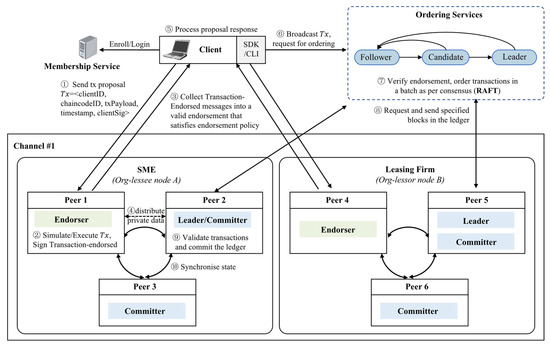 Since various transactions are executed through triggering relevant smart contracts (e.g., lease contract, asset ownership transfer contract, lease payment contract, data sharing contract) using multiple organizational nodes, a consensus protocol is used by the CBLP. It plays a crucial role in ensuring that the transactions are recorded in an agreed order on-chain. Meanwhile, to avoid the untrusted consortium stakeholders uploading false information or changing the private data content on-chain to comply with the contract, we use a Raft consensus algorithm combined with “credit” incentives to maintain the blockchain. That is, an SME (Org-lessee node A) and an LF (Org-lessor node B) adopt the flow of “execute–order–validate” to record the transactions on-chain [45]. This is the most fundamental transaction process of Hyperledger Fabric at present and will not be elaborated on further due to the limitations of this paper’s length, while it is depicted in Figure 2.