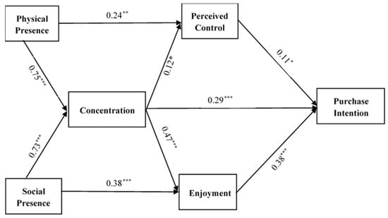 We then tested the mediating effects of concentration and enjoyment on the relationship between social presence and purchase intentions (gender, age, and education as control variables). The bootstrapping results indicate that the indirect effect of concentration as a mediating variable is 0.22 (95% CI = [0.1341, 0.3148]). The indirect effect of enjoyment as a mediating variable is 0.14 (95% CI = [0.0872, 0.1959]). The indirect effect of concentration and enjoyment together as mediating variables is 0.12 (95% CI = [0.0817, 0.1753]). All the indirect effects add up to 0.48 (95% CI = [0.3924, 0.5743]). Hence, the proposed chain mediating effects of concentration and enjoyment on the relationship between social presence and consumers’ purchase intentions are also supported (please see Table 8). The final model is shown in Figure 2.