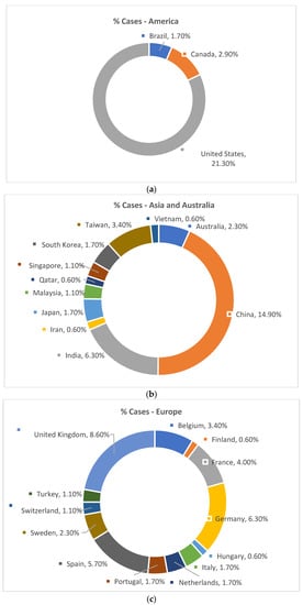 The geographic distribution of documents: (a) Region America; (b) Region Asia and Australia; (c) Region Europe. Source: Authors based on the Web of Science.