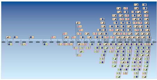After separating documents into regions, we managed to arrange them on a time axis in order to highlight the temporal distribution. The diagram in Figure 3 shows a ten-year period from 2001 to 2011 with little focus on the theme of interest. However, around 2012, there is a remarkable effort from researchers, belonging mainly to the America region. The research documents begin to spread on the diagram from all three regions, increasing gradually from one period to another.