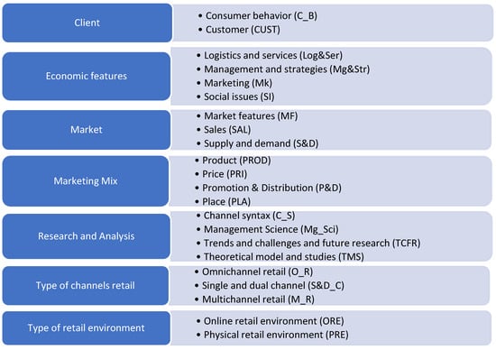 To move on in our analysis, the categories of descriptors from the dictionary will be further presented. The keywords included in each descriptor category were obtained after studying the list of frequencies generated by QDA Miner for words extracted from each document’s content. Thus, different keywords were retained and thematically grouped on descriptors. Then, two or more descriptors joined one of the seven categories of descriptors: Client, Economic features, Market, Marketing mix, Research and Analysis, Types of channels retailing, and Types of retail environment. Thus, the dictionary contains 22 descriptors grouped into seven categories.