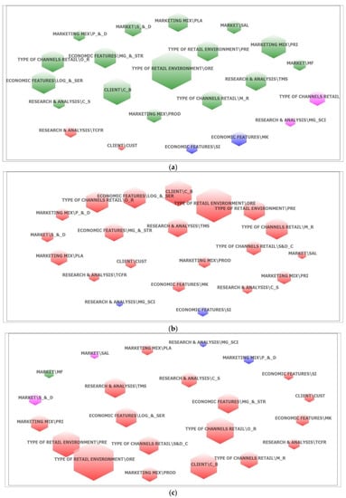 Dominant clusters also appear in the European and Asian and Australia conceptual maps (Figure 5b,c), both designed in red. However, the distances among nodes in these clusters as compared to the dominant green cluster in America, are larger.