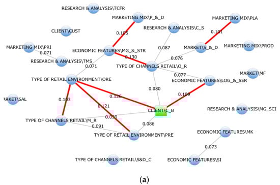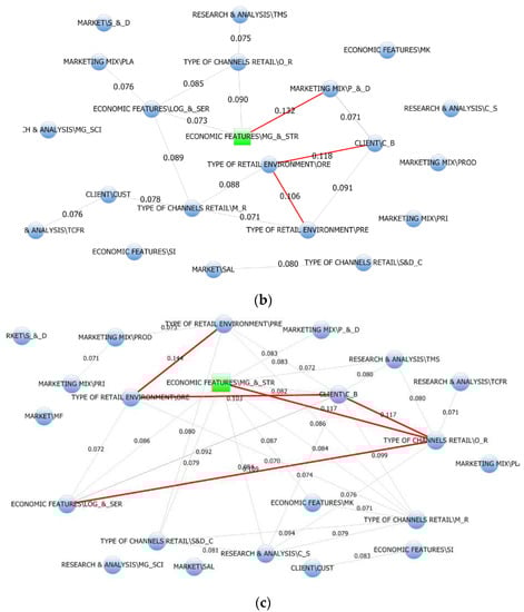 Moving forward to the link analysis, Figure 6 facilitates understanding of the connections between clustered descriptors, separately for each region. Visually, the most powerful links are signaled in red and they appear for values over 0.1 for the Jaccard’s coefficient. Each node (descriptor) is plotted given its relative co-occurrence. For instance, for the first region, America, the strongest connections appear around nodes referring to specific descriptors from the following categories: Economic features, Types of channel retail and Client. Documents containing these types of descriptors are characterized by a relatively high level of similarity.