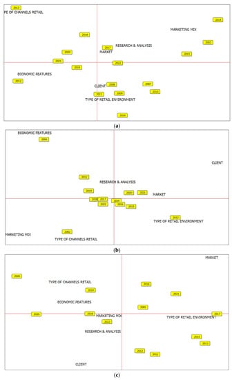 One can observe from Figure 7 that the categories of descriptors spread differently depending on each region. For instance, the first map, for America, reveals the fact that research on the Types of channels retail is specific to 2013, while categories of keywords such as Market and Research and Analysis dominate the 2017 year. Years 2008, 2009, 2011 have in their proximity descriptors from Client and Type of retail environment categories.