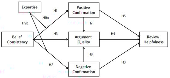 The inference regarding how people’s belief systems distort the valuation of information is derived from the effect of confirmation biases []. The proposition to consider that helpfulness beliefs of product reviews stems from people’s confirmation biases is totally exaggerated and not the purpose of this study. However, the processing of user-generated persuasion is probably driven by biased information and/or biased judgment, given that subjective or emotional messages are spread in the persuasion []. Building on two assumptions, we took the combination of belief consistency and positive–negative asymmetry as the cognitive-information lens to examine the connection between biased judgment and biased information in the context of user-generated persuasion, which has been little examined in the literature. We addressed whether the approach to biased judgment or biased information has a significant effect on the evaluation of review helpfulness, which extends this knowledge in the literature.