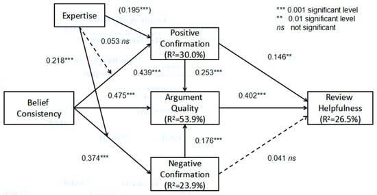 Overall, the empirical results of this study supported the connection between pre-belief (e.g., consistent beliefs) and post-belief (e.g., helpfulness beliefs) that underlies the positive–negative review frame. It is reasonable to apply the pre-belief-information–post-belief link to examine how biased judgment and biased information might distort review judgment. Accordingly, we inferred a reinforcement-influencing cycle, i.e., more consistent beliefs lead to the collection of more consistent or one-sided information, and the collection of more consistent or one-sided information leads to the formation of more consistent beliefs. The third implication is that a reinforcement-influencing cycle is inferred from using the cognitive-information lens to examine the positivity/negativity confirmation of user-generated persuasion that is consistent with the view of positive affective value [].