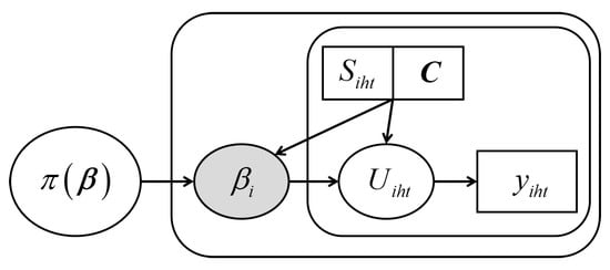 The Bayesian inference model allows us to investigate the decision making in a microscopic individual-level process with user heterogeneity [12,15,26,30,31]. This is different from aggregated point estimates by conventional discrete choice models. and are independent conditional on the latent utility . Therefore, a Gibbs sampling algorithm can compute the posterior distribution of and :
