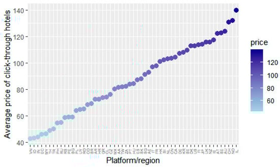 A user starts a search in a mobile travel search app, and her search queries are always associated with destination firstly, and they eventually click item(s) through to book a hotel or end this session with the no-click-through decision. Figure 4 shows that users from different regions have varying hotel price preferences during the mobile booking process. Factors such as the popularity of the platform or region, income difference in different regions, and the demand for travel in that area can all affect the average price of a click-through hotel. The study will examine the price effect on mobile CTDs by assuming that the price preference varies across regions. In other words, this study controls the region where the users accessed the OTA search platform Platform. The detailed information about the average price of click-through hotels in different regions is also presented in Table A1 in Appendix A.