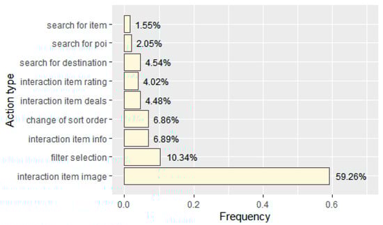 In addition to click-through behavior, mobile OTA search activity includes individual users’ searches, filters, refinements, and interactions with item ratings, deals, and images. Figure 5 shows the distribution of user action types, with the majority of users interacting with item images (59.26%), which is followed by the use of refinement tools such as filter selection (10.34%) and changing the sort order (6.86%).
