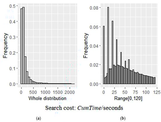 The properties of mobile users’ search cost: CumTime/seconds: (a) Whole distribution of CumTime/seconds; (b) Range [0, 120] of CumTime/seconds.
