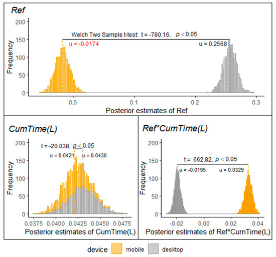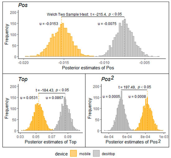 Akin to the findings in previous studies in travel information search engines [3,14] or PC-based internet [15,16,18], the upper panel of Figure 7 illustrates that the position of an item (Pos) has a negative and statistically significant effect on users of both mobile and desktop devices, as 0 falls outside the 95% posterior Bayesian credible interval, similar to point estimates with statistical significance at p < 0.05. However, their posterior means are different (β1m = umobile = −0.0153, β1d = udesktop = −0.0075, t = −215.4, p < 0.05, similarly hereinafter). This suggests that there is a stronger negative effect of Pos in mobile OTA search. In other words, mobile users are more likely to click-through a hotel that appears earlier on an SERP than PC users (|umobile| > |udesktop|).