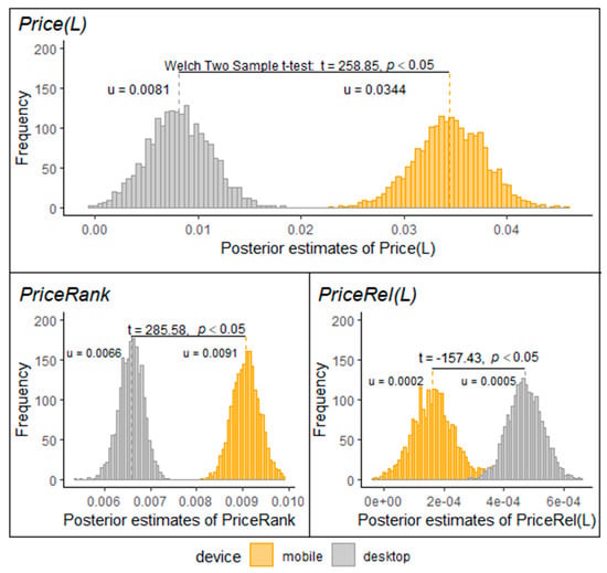 We analyzed the price effect by inspecting the detailed price-related posterior distribution as shown in Figure 8. The upper panel shows that Price has a positive sign in both a mobile OTA search and desktop OTA search, since zeros lie outside the 95% posterior Bayesian credible intervals. The PC-based finding is different from previous findings [15,23], which shows that price is negatively associated with consumer click behaviors in PC-based internet. Nevertheless, the impact on desktop CTDs is slight (i.e., 0.0081). On the contrary, the positive effect of the absolute price is statistically consistent and relatively greater for mobile users (i.e., 0.0344, t = 258.85, p < 0.05), after controlling the hotel property type Property, hotel class Class, overall guest rating Rating, and the regional platform located Platform. Owing to time constraints when users intend to book a hotel using mobile apps, users have to visit more to acquire more knowledge [3]. A higher price of an item tends to signal higher quality [42], which helps mobile users alleviate information asymmetry and quickly obtain knowledge. Hence, one possible explanation is that the higher the price of a hotel, the higher the quality signal mobile users are more likely to receive to click-through that hotel.