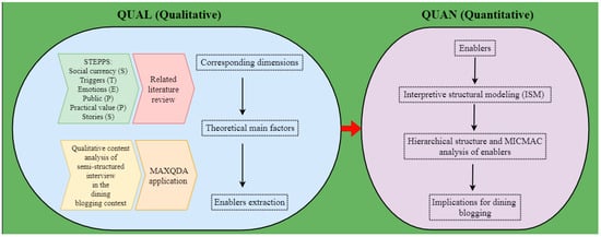 Once these enablers were identified, the present study sought to determine the hierarchical structure among them from the perspective of a blog reader. The number of variables as well as the complexity and uncertainty regarding their structural relationships made this problem a good match for interpretive structural modeling (ISM) [17]. Accordingly, this study integrated qualitative content analysis with the quantitative approach of ISM to explore the research questions. Note that this kind of mixed-method approach is increasingly popular in practical empirical research [18,19]. To fill gaps in existing research, the following two research objectives were proposed: