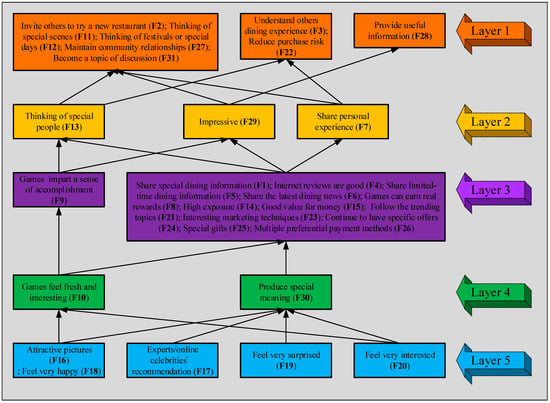 Based on the results of Figure 4 and the ACB model, the theoretical relationships among the 31 enablers were categorized, as shown in Figure 6. The five enablers of Layer 5 (F16, F17, F18, F19, and F20) can be interpreted as perceived affective quality, which is a precursor to cognitive beliefs and behavioral intentions [81]. The enabler of Layer 4 (F10) incorporates gamification mechanisms into dining blog designs, which exploit the natural human tendency towards playfulness [82]. The enabler of Layer 4 (F30) produces a special significance that engages blog readers [83]. The enabler of Layer 3 (F9) focuses on achievement. Achievement goals are cognitive representations that guide behavior towards a future goal [84]. The enablers of Layer 3 (F1, F4, F5, F6, F8, F14, F15, F21, F23, F24, F25, and F26) represent perceived value, which are blog readers’ subjective impressions of the perceived benefits and losses of a good or service [85]. The enablers of Layer 2 (F7, F13, and F29) represent information sharing, which refers to sharing one’s information with others and the embedding of the notion of “willingness to share” [86]. The enablers of Layer 1 (F2, F3, F11, F12, F22, F27, F28, and F31) satisfy social needs, which means that users meet and talk to others to gain peer support and a sense of community [87].
