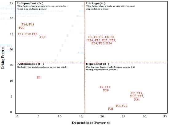 In the fifth step of ISM, partitioning resulted in a rearrangement of the reachability matrix into a five-layer hierarchy. As shown in Figure 4, the enablers in the rectangular box indicate that there is an interrelationship between the enablers. The enablers on the top layer are F2, F3, F11, F12, F22, F27, F28, and F31. The enablers on the second layer are F7, F13, and F29. The enablers on the third layer are F1, F4, F5, F6, F8, F9, F14, F15, F21, F23, F24, F25, and F26. The enablers on the fourth layer are F10 and F30. The enablers on the bottom are F16, F17, F18, F19, and F20. Although ISM offers a detailed representation of the relationships existing among the enablers, it does not measure their driving and dependence power. This limitation can be overcome through integration with MICMAC [73].