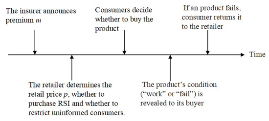 - Scenario RR: Both the insurer and the retailer have the restricting right. In this case, the insurer restricts uninformed consumers from obtaining RSI and decides the premium m. Then, the retailer decides the retail price p and whether to purchase RSI and restrict uninformed consumers from buying the product. Finally, consumers make their purchase and return decisions.