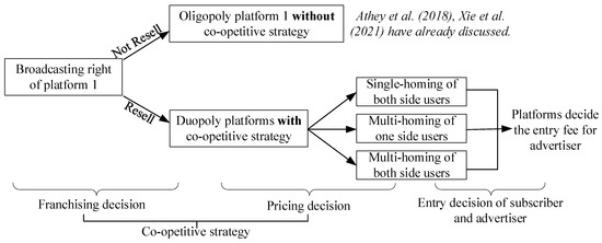As the online platform ecosystem expands in popularity, the subscribers place a higher value on watching experiences, preferring live streaming over replay [5]. Evidence shows that Facebook live-streaming videos are ten times more likely to elicit comments than recorded videos, are watched three times longer than ordinary videos, and have grown in popularity by over 330% since the rollout. With the development of internet-based social networks and more users joining online video platforms, real-time word-of-mouth becomes more effective in facilitating the bandwagon effect; that is, the interaction between two-sided users will be enhanced in the live-streaming content market. As a result, the network externality effect of platforms is significantly amplified in this case. To benefit from this effect, the content creators begin to embrace a co-opetitive strategy, in which a primary streaming platform possesses the broadcasting rights, and then its competitive platform purchases the right of re-broadcasting before vying for users with this platform [6]. For example, in 2018, China Central Television shared its re-broadcasting right of the FIFA World Cup with Migu (miguvideo.com, accessed on 1 March 2023), bringing a three-times increase in Migu’s daily active users compared to 2017 [7]. Similarly, Netflix made a contract with Youku (a Chinese streaming video platform) to share the broadcasting right of Day and Night across 190 countries and regions [8]. The reason for live streaming content platforms pursuing co-opetition is that the cross-side network effect will be significantly enhanced by this strategy in a two-sided market [9]. Cross-side network effects refer to the impact that one side of the platform (in this case, the advertisers) has on the other side (the subscribers).