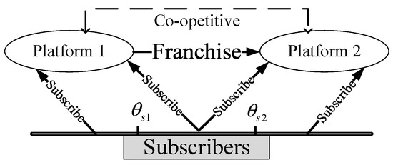 In this two-sided market, the platforms constitute a co-opetitive structure, as shown in Figure 1, in which platform 1 serves as both the content provider (cooperator) and the market competitor to platform 2 [9].