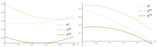 Substituting Equations (5) into (6), we can calculate the first and second-order partial derivatives of profit functions with respect to and , respectively. According to the first-order conditions of both Platforms 1 and 2, we have the optimal pricing decisions. Then, substituting the optimal results into Equations (5) and (6), the equilibrium market demand and profits of platforms can be obtained as Proposition 1.