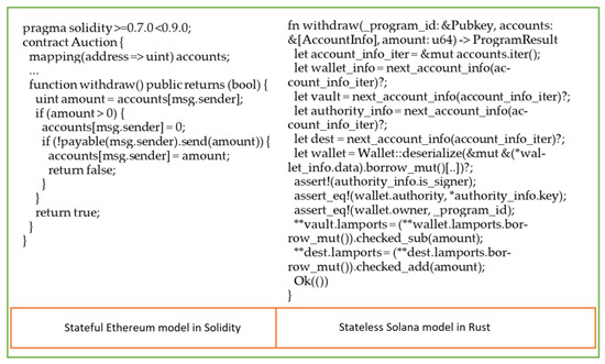 In Figure 1, the same withdraw function is written in Rust for Solana and in Solidity for Ethereum. Because of the stateless design, in Solana, all states must be provided as input parameters; thus, such smart contracts are more complicated to write and understand.
