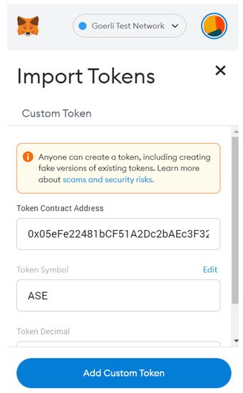 Appendix A shows an example of a JSON file containing an Ethereum address. The file and the password can be sent through different channels (e.g., the file by email and the password by a mobile app or by SMS). The voters will first import the account from the JSON file and then add the token as a new asset (Figure 4).