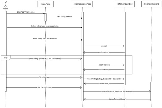 As depicted in the sequence diagram (Figure 5), tamperproof data should be stored on-chain (i.e., the token, the votes) while for data that can be changed, it makes better sense to store them off-chain (i.e., data about the voters and about each voting session, multimedia files). Storing data off-chain makes updating and retrieving easier, reducing costs at the same time if the fees are paid in real ETH. However, after the token SC has been deployed for a voting session, updating off-chain data such as voting interval, voting type, or voting options is no longer possible.