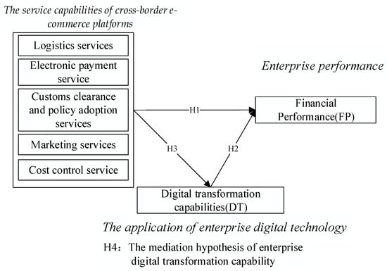 This study proposes a theoretical model that illustrates the relationship among platform service capability, enterprise digital transformation capability, and enterprise performance in cross-border e-commerce. The model posits that the service capabilities of digital platforms have a direct impact on enterprise performance. Additionally, enterprise digital transformation capability serves as a mediating variable, which influences the process of platform service capability affecting enterprise performance. The theoretical model is shown in Figure 1.