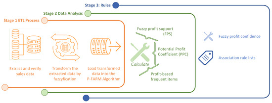 The proposed method extracts hidden patterns from the e-commerce sales volume and profit, called Profit-Support Fuzzy Association Rule Mining (P-FARM). Figure 1 shows the proposed methodology. It consists of three stages: ETL (Extract, Transform, Load) process, data analysis, and rules.