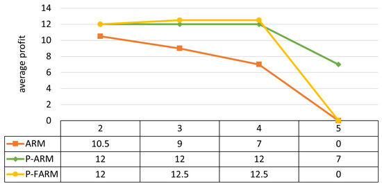 The number of recommended products depends on the minimum support threshold. Figure 2 depicts the effects of minimum support values on the methods. In every case, P-FARM is better or at least better than others. It means the average profit of the recommended products by P-FARM is better than those by ARM and P-ARM. Because ARM and P-FARM did not become applicable, the results yielded with with five should be ignored.