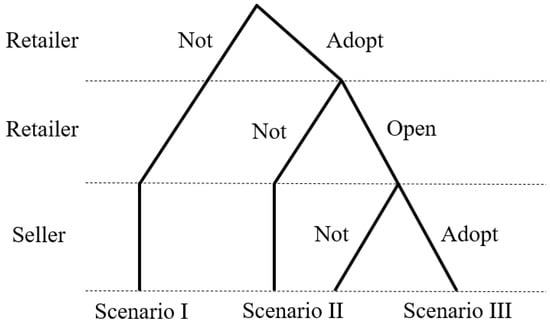 We consider three scenarios in this study: the case without livestreaming (Scenario I); the case in which only the retailer adopts livestreaming (Scenario II); the case in which both the retailer and the seller adopt livestreaming (Scenario III). Note that Scenario II represents two cases in Figure 2: the case in which the retailer adopts livestreaming but does not open livestreaming to the seller and the case in which the retailer adopts livestreaming and opens it to the seller but the seller does not adopt livestreaming. Since the outcomes of these two cases are the same, we use Scenario II to represent both cases and analyze them separately afterward.