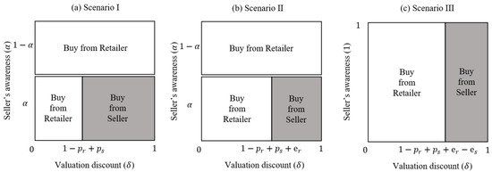 A continuum of consumers with unit mass is in the market and each of them has a unit demand for the product. They only purchase from a firm when they are aware of the firm. When they are aware of both the retailer and the seller, they purchase from the firm with the higher utility. Because of the retailer’s awareness advantage, all consumers are aware of the retailer whereas initially, only a proportion of consumers are aware of the seller, where . We use to denote the highest value that consumers can get when they purchase the product. Regarding the valuation advantage, consumers derive the highest value when purchasing from the retailer. When they purchase from the seller, the valuation they derive is discounted since the seller’s return policy, customer service, etc., are not as good as the retailer, and this consumers’ perceived valuation discount differs. Let denote this valuation discount, then consumers derive when purchasing from the seller, where is uniformly distributed over across all consumers. This is used to depict the vertical differentiation of the product offerings from the retailer and the seller and capture the essential idea when everything else is equal, consumers prefer to purchase high-quality products over low-quality products [39,40]. Without loss of generality, we normalize to 1 and the marginal costs of selling the product to 0.