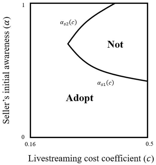 To summarize the retailer’s overall adoption decision in the super game, the retailer adopts livestreaming when the livestreaming cost coefficient is relatively low, even when the seller’s initial awareness is low. Additionally, the retailer also adopts livestreaming when the seller’s initial awareness is high and the livestreaming cost coefficient is not too high.