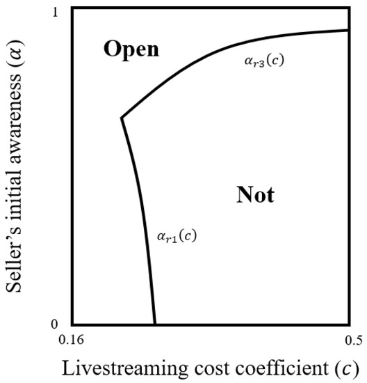 Figure 4 demonstrates Proposition 2 when and . The retailer opens livestreaming to the third-party seller when both the initial awareness of the seller and the livestreaming cost coefficient are relatively low or when the initial awareness of the seller is high.