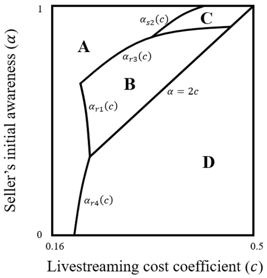 We can conclude the conditions for the equilibrium outcomes in Figure 5 as follows. When the livestreaming cost coefficient is relatively low or it is intermediate and the seller’s initial awareness is high (the A area), the retailer adopts and opens livestreaming and the seller also adopts it. However, when both the livestreaming cost coefficient and the seller’s initial awareness are at an intermediate level (the B area), the retailer adopts livestreaming but does not open it to the seller. When the livestreaming cost coefficient is not low and the seller’s initial awareness is high (the C area), the retailer adopts and opens livestreaming but the seller does not adopt it. Lastly (the D area), the retailer does not adopt livestreaming on its platform.