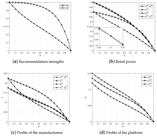 - The equilibrium prices , and recommendation strength decrease with product substitutability θ. The profits of manufacturers , and platform decrease with θ.