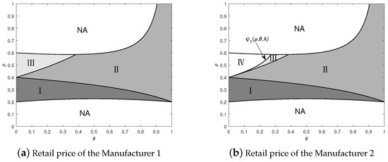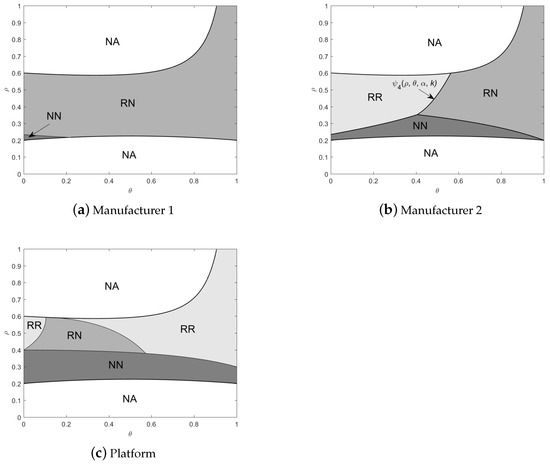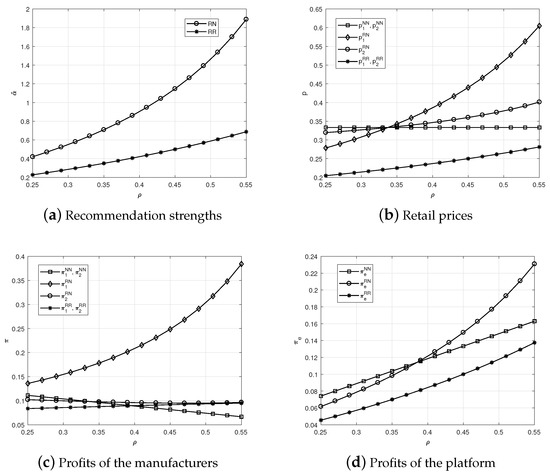 - , and increase with commission rate ρ. When , or and , the profit of manufacturer who is recommended increases with ρ; when , or and , decreases with ρ. The profit of platform increases with ρ.