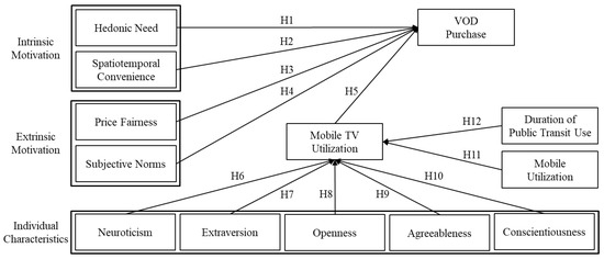 Mass communication theorists have long studied the role of personality factors in media use [55]. Rosengren [36] contends that an individual’s personality has a pervasive impact on various stages of media selection, use, and consequences. Similarly, Weaver [56] asserts that customer behavior should be influenced by predominant personality characteristics. Correa et al. [57] find that users’ personality traits can be crucial factors driving media use. Ross et al. [58] explore the relationship between the Big Five personality traits and Facebook use, while Meng and Leung [59] examine the relationship between the Big Five model and TikTok engagement. In light of the Big Five personality model, we aim to investigate how different personality factors affect mobile TV utilization, the primary variable in our study of VOD purchases.