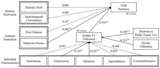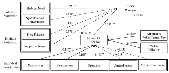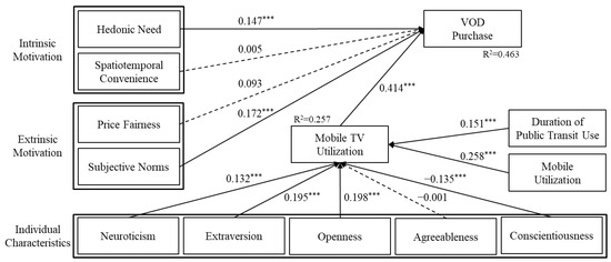 Our study employs structural equation modeling with the PLS technique, and the bootstrap resampling method is utilized with a total of 500 resamples to establish the significance of the research hypotheses. Our findings support most of the hypotheses, with the exception of H2, H3, and H9. Our results indicate that hedonic needs significantly influence VOD purchases, thus supporting H1. However, as spatiotemporal convenience and price fairness do not have a significant impact on VOD purchases, H2 and H3 are not supported. In addition, subjective norms have a significant influence on VOD purchases, which supports H4. Our study also finds that mobile TV utilization significantly impacts VOD purchases, supporting H5. Furthermore, our findings indicate that neuroticism, extraversion, and openness significantly influence mobile TV utilization, thus supporting H6, H7, and H8. However, agreeableness does not significantly impact mobile TV utilization, and H9 is not supported. Our study also finds that conscientiousness significantly influences mobile TV utilization, supporting H10. In addition, our results suggest that mobile utilization and the duration of public transit use significantly impact mobile TV utilization, therefore supporting H11 and H12. The results of the hypothesis test for our research model are displayed in Figure 2.