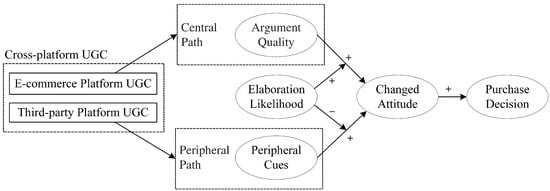 In our research, according to the ELM, when faced with cross-platform UGC, customers may employ different processing paths, namely the central path and the peripheral path, based on their motivation and elaboration ability to process information. These differential processing strategies are expected to influence customers’ attitudes, which in turn will impact their purchase decisions. The conceptual model of our research, which is based on the cross-platform UGC perspective and ELM theory [60,62], is illustrated in Figure 1.