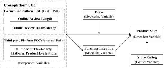 To clarify how cross-platform UGC affects consumer purchase decisions and sales for experiential products, this study builds a research model based on the conceptual model in Figure 1, and the research model is illustrated in Figure 2. The central path focuses on the impact of online review length and online review inconsistency on product sales on e-commerce platforms. The peripheral path investigates the impact of the number of product evaluation videos on third-party platforms on product sales. Additionally, cross-platform UGC may influence sales by affecting consumers’ purchase intentions [53], which are highly responsive to pricing [28,58]. For instance, Monroe [68] demonstrated that customers have absolute thresholds for prices, and when a price surpasses these upper or lower thresholds, customers will decline the purchase due to the price. Therefore the model explores the mediating effect of purchase intention and the moderating effect of the product price on the relationship between cross-platform UGC and product sales. Moreover, store rating is included as a control variable to eliminate the influence of store dimensions on product sales, as consumers often use store rating as an important reference for consumption decisions [69,70].