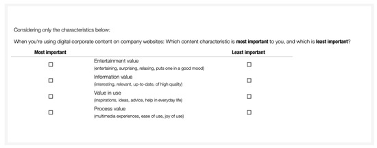 Next, to construct the BWS choice sets for the five characteristics of digital corporate content, a balanced incomplete block design (BIBD) was generated using RStudio (2021.09.0 + 351), R (4.1.2), and the bwsTools package (1.2.0). A BIBD ensured that all choice sets had the same number of items, that each characteristic occurred equally often across all choice sets, and that pairwise comparisons among all characteristics appeared the same number of times, thus preventing unintended signals from being given to study participants (e.g., inference to a putative study objective) [17]. A design was chosen in which the v = 5 content characteristics of interest were shown in a series of b = 5 choice tasks, each with k = 4 content characteristics. Each content characteristic was presented a total of r = 4 times across all choice tasks and coappeared with each other content characteristic λ = 3 times. The position of the content characteristics within the choice sets and the order of choice sets were randomized to mitigate any order effects. Each study participant responded to all five choice tasks. Figure 1 displays an example of a BWS choice set.