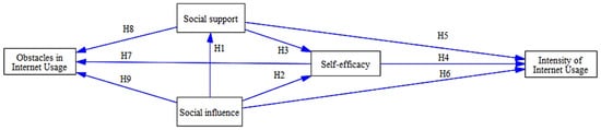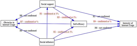 Moreover, various authors emphasise social support as an important factor for successfully using ICT and the Internet, such as [22,24,29,30]. According to [31], social support is vital for older people to accept ICTs, such as using tablets for communication. Similarly, ref. [32] points out the importance of social support in adopting and using information and communication technologies and the Internet. Moreover, in their study, ref. [33,34] accentuates the significance of social support as support from acquaintances in the context of proper support in learning how to manage new technology or in the context of emotional support in using information and communication technology. Accordingly, the next hypothesis is imposed and investigated in this work: