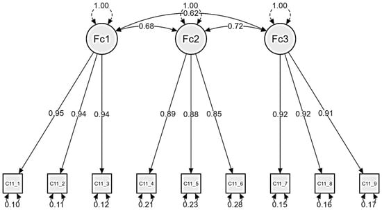 CFA analysis was performed for the entire sample. A three-factor model was established, with the factors being namely self-efficacy, social influence, and social support. The graph of items with their established factors is presented in Figure 2. Manifest variables C11_1–C11_3 were loaded on the self-efficacy factor; the variables C11_4–C11_6 were loaded on the social influence factor; and the variables C11_7–C11_9 were loaded on the social support factor. All latent factors were assumed to be correlated with each other, as the variance of the factors was set to 1.0. A covariance matrix with a maximum likelihood (ML) method was used to estimate the parameters.