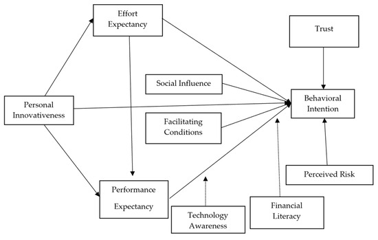 UTAUT and UTAUT2 have been extended by incorporating relevant constructs such as personal innovativeness, trust and risk to determine the adoption of emerging financial technology domains such as m-payments [41,42,43], internet banking [43,44] and internet-based crowdfunding [45]. Digital currencies are currently in their nascent stage and built on a new backend technology of blockchain that generates multiple new propositions such as decentralisation, programmability, immutable transactions and auditability of money for users. Hence, we extended the UTAUT2 model with personal innovativeness [46], trust [47] and perceived risk [48], along with technology awareness [49,50] and subjective financial literacy [51] as moderators.