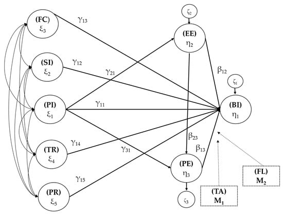 where η is the endogenous construct, γ is the relationship between the exogenous constructs to endogenous constructs, ξm is the exogenous construct and m is the number of exogenous construct. ζ is the measurement error for ηn and n is the number of endogenous constructs. β is the relationship between endogenous constructs to endogenous constructs” [91]. The path diagram of the structural equation is presented in Figure 2. The structural equation for our proposed model is as follows: