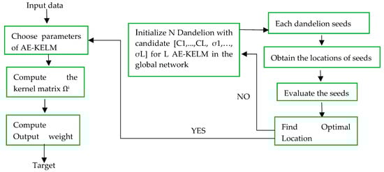 Our study proposes a stacked autoencoder kernel ELM optimized by the dandelion algorithm (S-AEKELM-DA). This study aims to solve the specified machine learning objective by splitting an extensive network into multiple AE-KELM as illustrated in Algorithm 2. The various AE-KELMs are stacked on different levels and connected serially. While C and σ are, respectively, the regularization factor and the kernel parameter of AE-KELM, they are randomly generated and optimized in the training phase without considering hidden nodes.