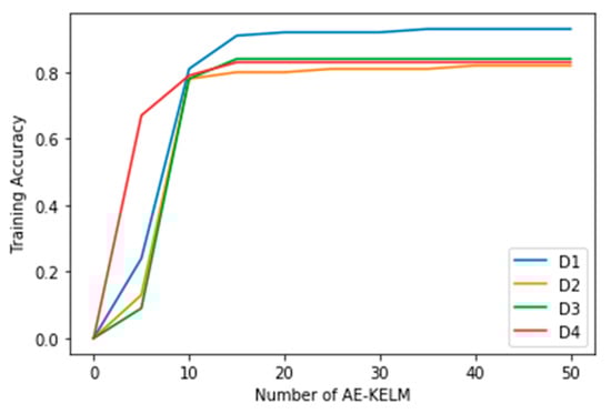 Training accuracy of the S-AEKELM-DA learning network proportionally with the number of AE-KELM.