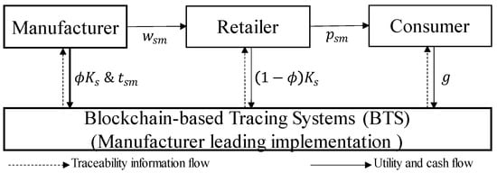 First, we explore the situation of the manufacturer leading the BTS implementation. For example, the Spirits maker Diageo announced the launch of a blockchain-based track-and-trace system for its bottles to combat counterfeiting, boost the company’s sustainability practices, and ensure the wine traceability is self-controlled and more flexible [62]. In Model SM, the manufacturer takes the lead to implement the BTS across the entire WSC and determines the level of SBT effort and the wholesale price first. Then, the retailer decides on the retail price . Consumer privacy concerns are consistent with the settings in Model B. The structure of the WSC in Model SM is shown in Figure 3, and the decision structure of the WSC in Model SM is shown in Table 3. Following the same market assumptions in the basic model, we have the demand and profit function in Model SM.