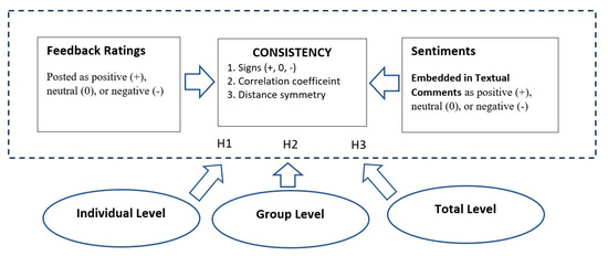 The research framework of this study is depicted in Figure 1. Under a well-designed feedback rating system, the positive, neutral, or negative ratings should effectively represent buyers’ corresponding positive, neutral, or negative sentiments. Such sentiments can be traced from the textual comments of buyers. In this study, we will study the consistency between ratings and sentiments in three dimensions: (1) check if signs (+, 0, −) of ratings and sentiments are the same for each rating type; (2) measure the correlation coefficient between ratings and sentiments; (3) measure the distances among three types of ratings and sentiments, respectively, and see if distance symmetry exists for both ratings and sentiments.